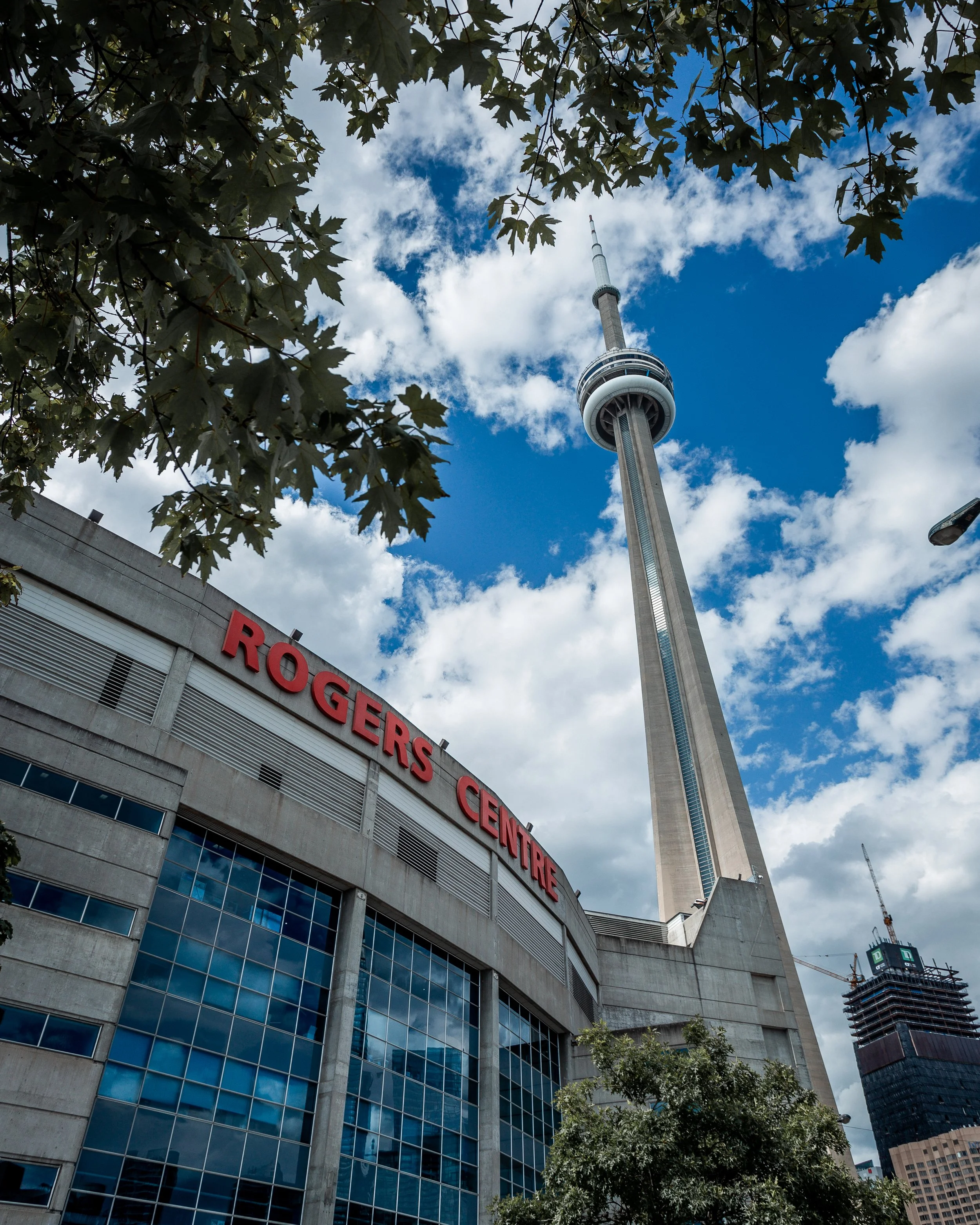 When I arrived Downtown the blue jay traffic started entering the city and although there was a significant amount of traffic it felt a lot like Pittsburgh during rush hour right before a Baseball game. Once I figured out where to park I made my way to the HTO park west where I took a bunch of up close photos of the tower with my telephoto lens. The sky was still partly cloudy so I was able to get a nice compressed image against the clouds and foliage in the trees. The nice thing about using a 70-200mm lens that you are not locked to focal lengths like 85mm or 135mm allowing me to save space in my bag for things like a lunch and water. Using a telephoto lens also allows the photographer to get a really nice compressed image where the subject bounces off of the background. I am very pleased with the results that I got when I was downtown; the photos of the tower are way better than the landscape photos of the city in my opinion. As I was heading back to my car I got to walk around downtown a little bit and the foot traffic did not seem any more congested than Pittsburgh. I was able to stop and get some nice wide angle shots of the stadium with the tower in the background